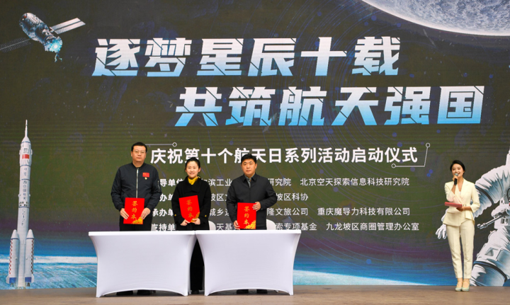 值得一提的是,在活動現場各方嘉賓的共同見證下,由北京空天探索信息科技研究院、哈爾濱工業大學重慶研究院和重慶渝隆文化旅游發展有限公司三方簽署了航天科普教育基地共建備忘錄,就合作共建航天品牌、推動航天文化進一步傳播達成一致意向。