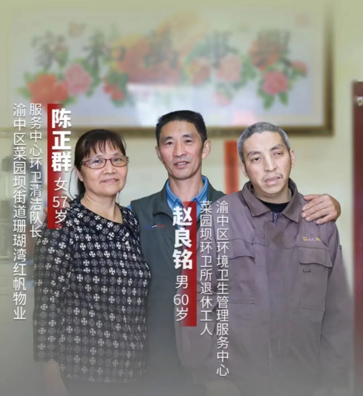 陳正群,女,57歲,群眾,渝中區(qū)菜園壩街道珊瑚灣紅帆物業(yè)服務(wù)中心環(huán)衛(wèi)清潔隊(duì)長;趙良銘,男,60歲,群眾,渝中區(qū)環(huán)境衛(wèi)生管理服務(wù)中心菜園壩環(huán)衛(wèi)所退休工人。