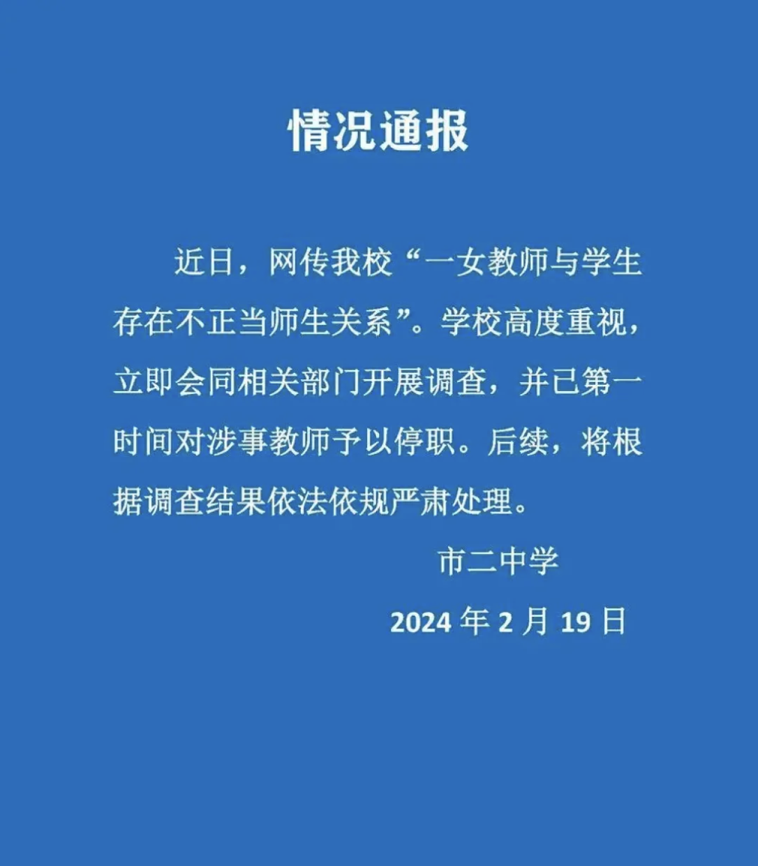 19日下午,上海市第二中學發(fā)布相關情況通報:近日,網傳我校“一女教師與學生存在不正當師生關系”。學校高度重視,立即會同相關部門開展調查,并已第一時間對涉事教師予以停職。后續(xù),將根據(jù)調查結果依法依規(guī)嚴肅處理。