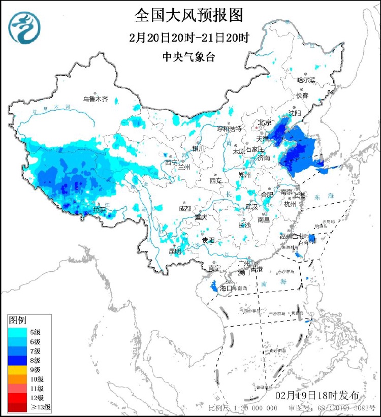 中央氣象臺2月19日18時繼續發布大風藍色預警:預計,2月19日20時至20日20時,西藏中西部、青海中南部、內蒙古中西部、遼寧南部、華北東部、黃淮西部和東部、江淮西部等地的部分地區有5~7級風,陣風8~9級。渤海、渤海海峽、黃海大部海域將有7~8級,陣風9~10級的大風。