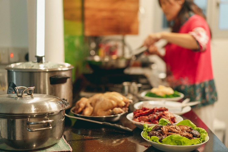小時候,臘月二十七八,家家戶戶就開始準備團年了,一家吃一天,我爸是大哥,先從我家吃起。爸爸在廚房里用砍刀宰著臘豬腳、臘排骨、土雞、土鴨等,媽媽則在煤炭灶臺上炸著滑肉、炸魚,炒著椒麻雞等。我們姐妹倆這時總會著去灶屋(那時我們管廚房叫灶屋)望嘴兒,圍著灶臺,眼睛直溜溜地瞅著鍋里的肉和魚,鼻子吸著撲鼻而來的香味。