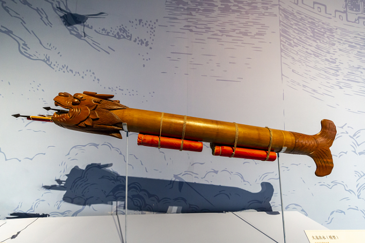 此外,還有以龍命名的遠射火器。其中,最著名的就是明朝中期發明的火龍出水。據《武備志》記載,火龍出水的制法是將5尺茅竹去節并用鐵刀刮薄,然后木制的龍頭、龍尾分別裝到茅竹兩端。然后將龍頭口部向上,龍腹內裝入數枚神機火箭,把火箭的藥線連在一起,從龍頭下部一個孔中引出,再在龍身下部前后兩端各傾斜裝上兩個大火箭筒,把它們的藥線也連在一起,最后把神機火箭的總藥線連在前邊兩個火箭筒的底部。在作戰時,火龍出水可以在距離水面三四尺高的地方點火,靠著二級火箭結構,火龍出水的射程可達2至3里,如火龍出江,更精妙的是待兩側火藥筒內的火藥燃完,龍腹內的火箭就會飛出攻擊敵船,使敵人船俱焚。火龍出水堪稱世界上發明最早的多級火箭,它也被《中國科學技術史》的作者李約瑟譽為“原始的阿波羅火箭”。